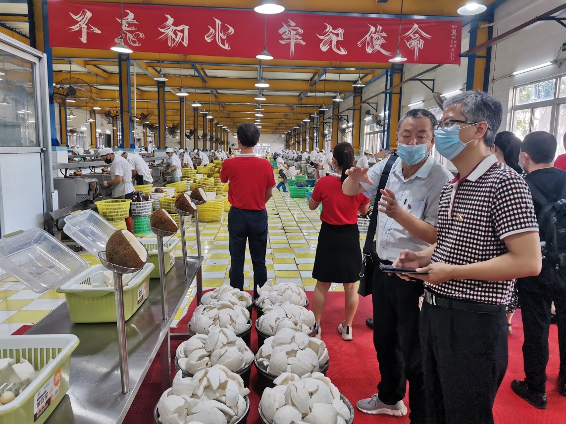 在袁颖书记和赵波总经理的引导下,全体人员文明有序地对生产车间和生产线进行逐一参观。通过袁书记的介绍,大家了解到椰树集团前身为海口罐头厂,建于1956年,是中国饮料工业十强企业之一,现有职工4000多人,具有世界一流的生产工艺和大规模自动化生产能力,是中国饮料行业唯一一家同时有两种产品荣获“中国名牌”称号的企业,也是唯一有四个饮品荣登国宴殿堂的企业。
