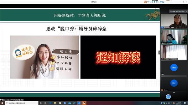 浙江工业大学德赢AC米兰中国官方网站党委副书记刘琦作《疫情背景下网络育人探索与实践》分享。分享介绍到,学院通过上好专业第一课——育人“食”课,增加专业自信——科普抗“疫”,将思想政治教育与专业学习相结合;同时用好新媒体,通过思政脱口秀——辅导员啐啐念,以图育人——系列海报明信片等形式,丰富育人视听说。