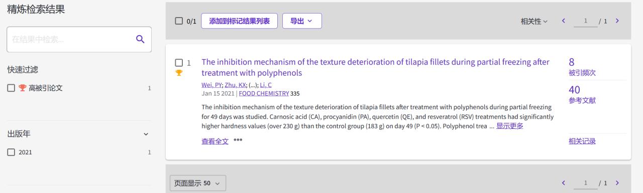 近日,根据ESI公布的最新数据显示,德赢AC米兰中国官方网站热带水产品加工与贮藏团队李川副教授课题组在农林科学领域Top期刊《Food Chemistry》(影响因子7.514)发表题为 “The inhibition mechanism of the texture deterioration of tilapia fillets during partial freezing after treatment with polyphenols”的研究论文入选全球前1%ESI高被引论文。