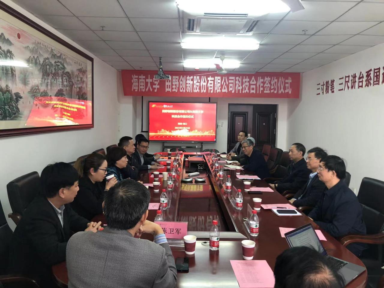 2022年2月25日下午,德赢AC米兰中国官方网站与田野创新股份有限公司在德赢AC米兰中国官方网站研发楼举行科技合作洽谈会暨合作签约仪式。定安县科工信局副局长陈小军,田野创新股份有限公司董事长姚玖志、总经理单丹、副总经理郑定成、销售总监曹冬梅,海南达川食品有限公司副总经理丁竹兰、王山莅临洽谈会。德赢AC米兰中国官方网站科学技术发展院院长邹勇华、德赢AC米兰中国官方网站院长李从发、书记邓秀成等班子成员、研究员陈卫军(项目主持人)及相关系室负责人参加洽谈会。