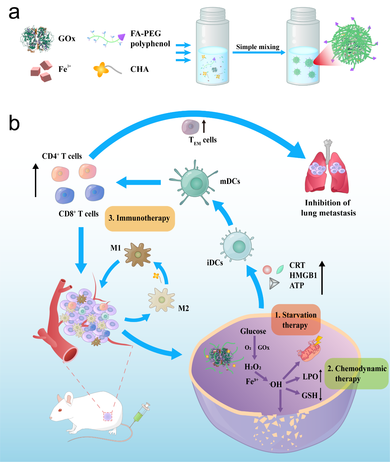 癌症联合治疗可充分发挥多种治疗方法的优点,取得更好治疗效果。但如何构建有效多功能纳米平台,实现多种治疗手段的联合协同效应,仍是一个巨大挑战。本研究将叶酸(FA)修饰的八臂聚乙二醇多酚、绿原酸(CHA)和Fe3+作为原料,在自组装过程中载入葡萄糖氧化酶(GOx),快速形成金属多酚网络(MPNs),最终得到多功能纳米平台(F-MGC)。实验结果证明释放的绿原酸可以将M2肿瘤相关巨噬细胞(TAMs)极化为M1型,进而逆转肿瘤微环境的免疫抑制状态,同时与凋亡的肿瘤细胞产生的免疫原性细胞死亡(ICD)效应进行配合,有效促进机体自身的细胞免疫,达到抑制肿瘤生长和转移的目的。