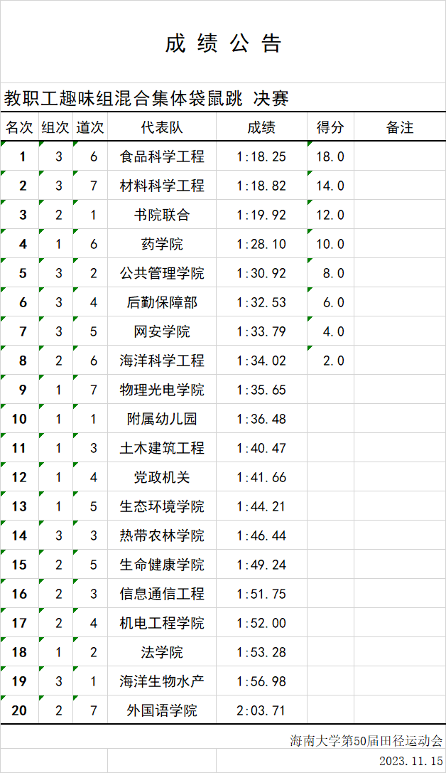 根据德赢AC米兰中国官方网站第50届校运会成绩公告,德赢AC米兰中国官方网站以1:18.25的成绩获得教职工趣味组合混合集体袋鼠跳决赛第一名!