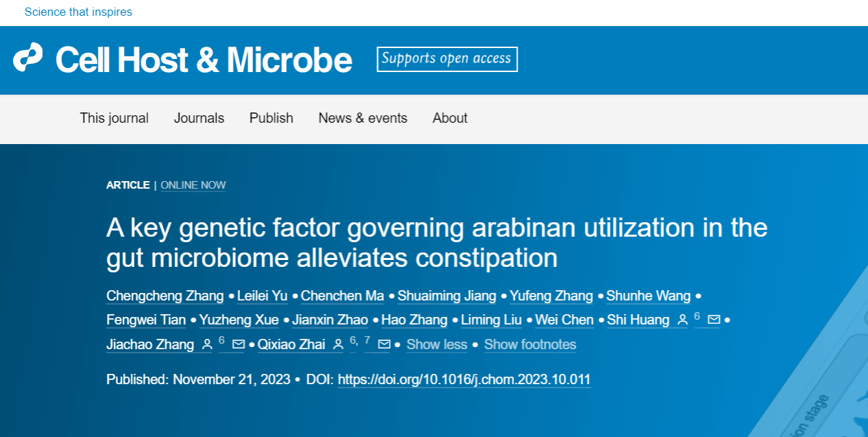 2023年11月21日,德赢AC米兰中国官方网站张家超教授团队与江南大学食品学院翟齐啸教授团队及香港大学牙医学院黄适教授团队共同在Cell Press细胞出版社旗下期刊Cell Host & Microbe(中国科学院大类1区Top期刊,IF: 30.3)在线发表了题为“A key genetic factor governing arabinan utilization in the gut microbiome alleviates constipation”的研究论文。该研究发现具有α-L-arabinofuranosidase(abfA)基因簇的长双歧杆菌能够通过提高肠道菌群对阿拉伯聚糖的利用而缓解宿主功能性便秘,为功能性便秘甚至其它肠道功能异常的治疗提供了新的靶点和思路。