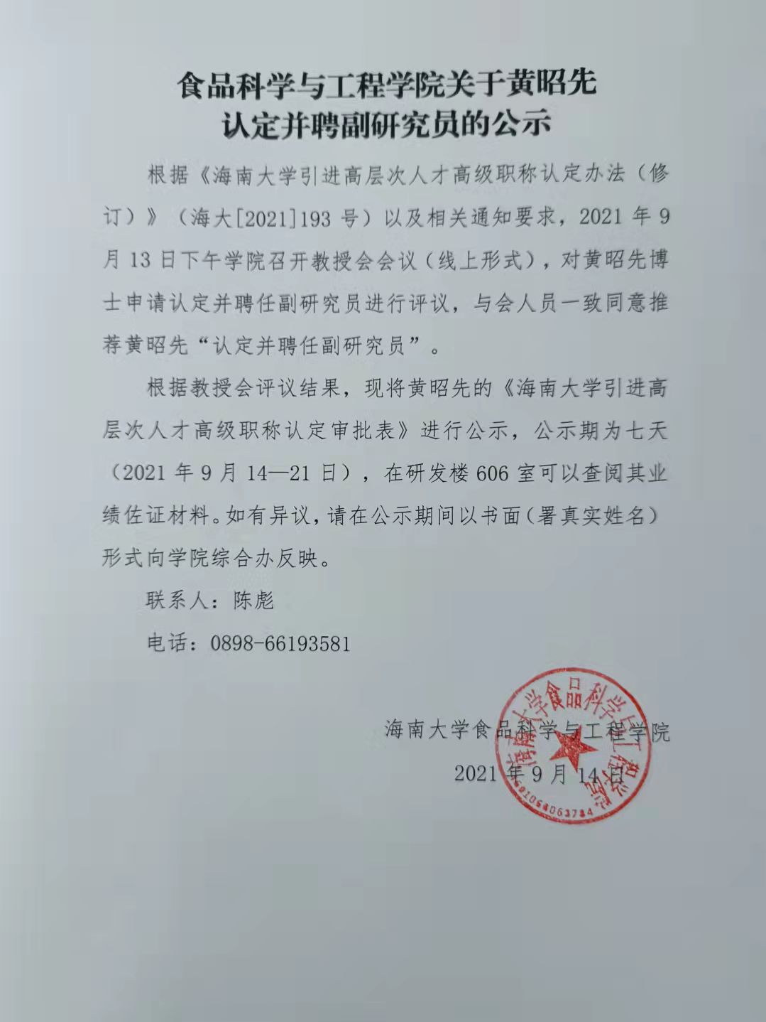 德赢AC米兰中国官方网站关于黄昭先认定并聘副研究员的公示