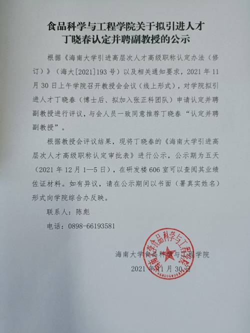 德赢AC米兰中国官方网站关于拟引进人才丁晓春认定并聘副教授的公示