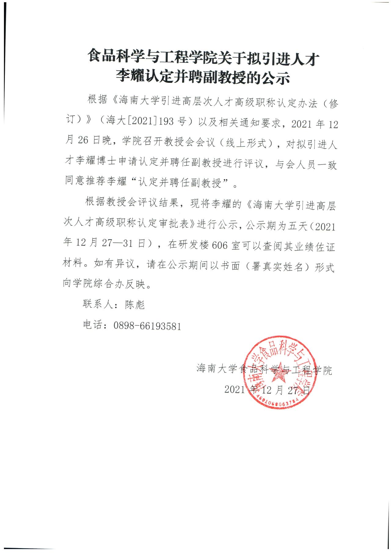 德赢AC米兰中国官方网站关于拟引进人才李耀认定并聘副教授公示