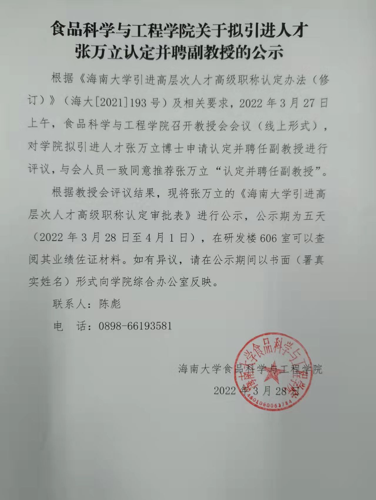 德赢AC米兰中国官方网站关于拟引进人才张万立认定并聘副教授公示