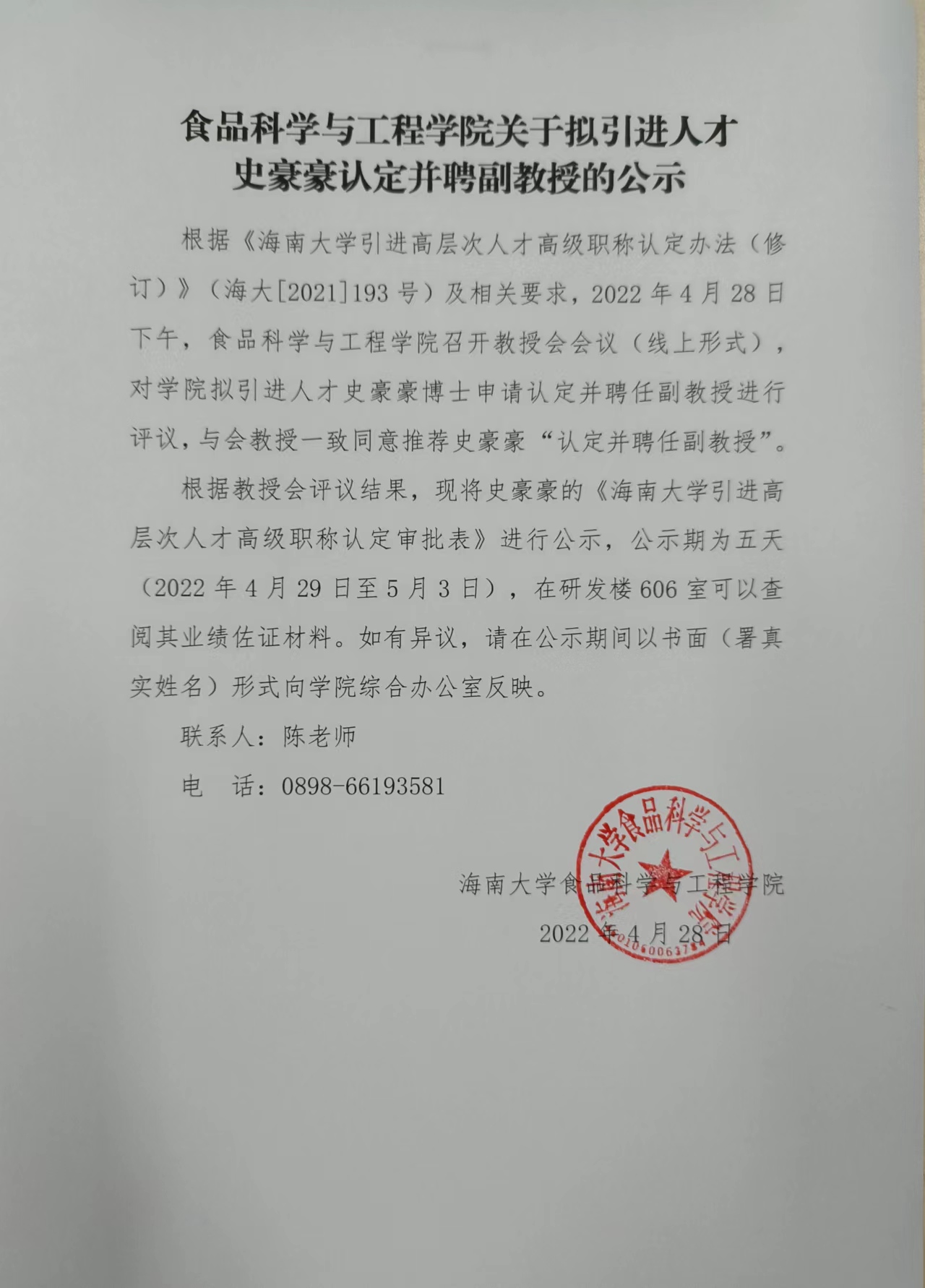 德赢AC米兰中国官方网站关于拟引进人才史豪豪认定并聘副教授公示