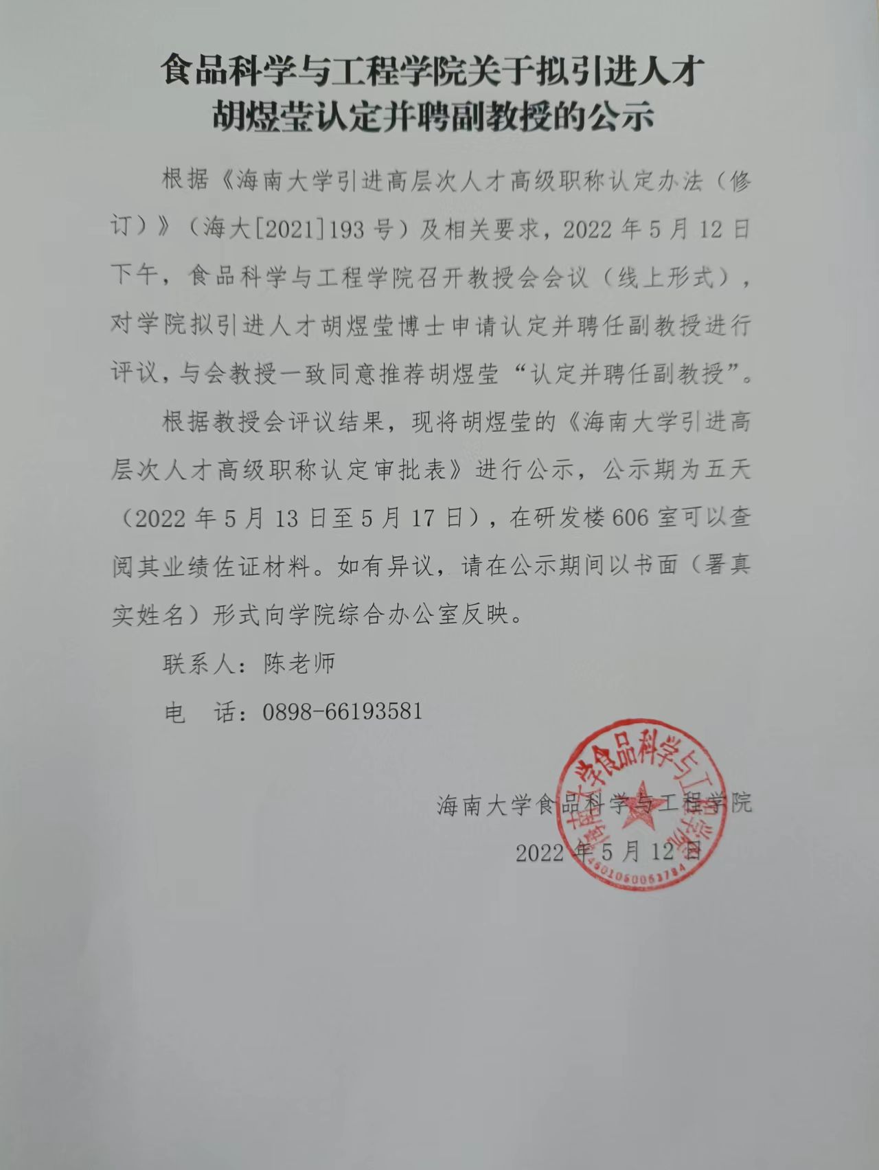 德赢AC米兰中国官方网站关于拟引进人才胡煜莹认定并聘副教授的公示