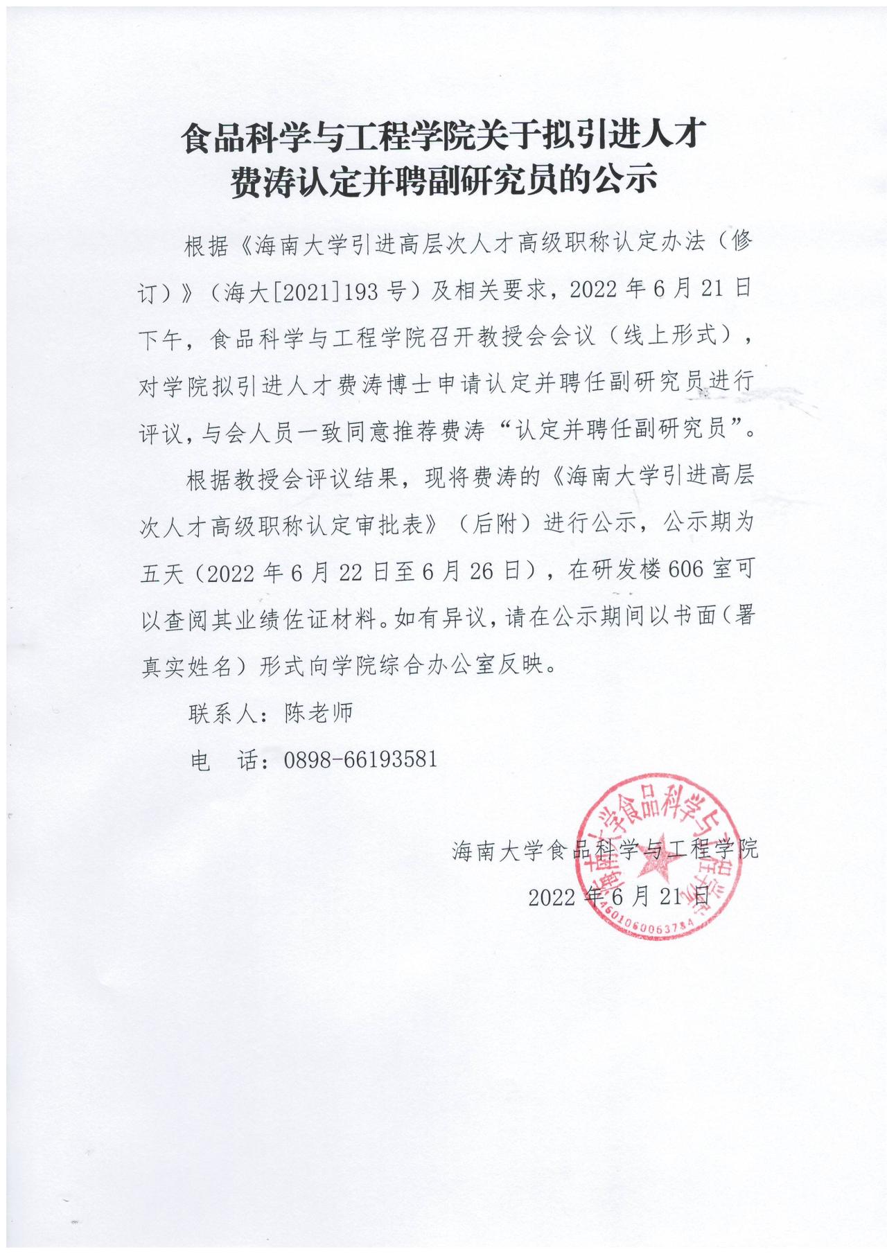 德赢AC米兰中国官方网站关于拟引进人才费涛认定并聘副研究员公示